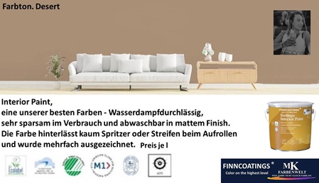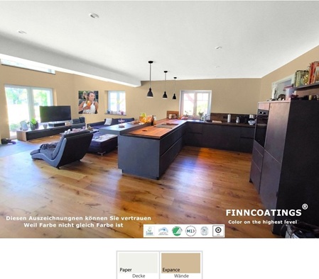 Die geruchsarme Innenraumfarbe-Formel hat einen sehr niedrigen VOC-Emissionsgrad. Dies wird durch M1- und EU-Ecolabel-Zertifikate bestätigt.